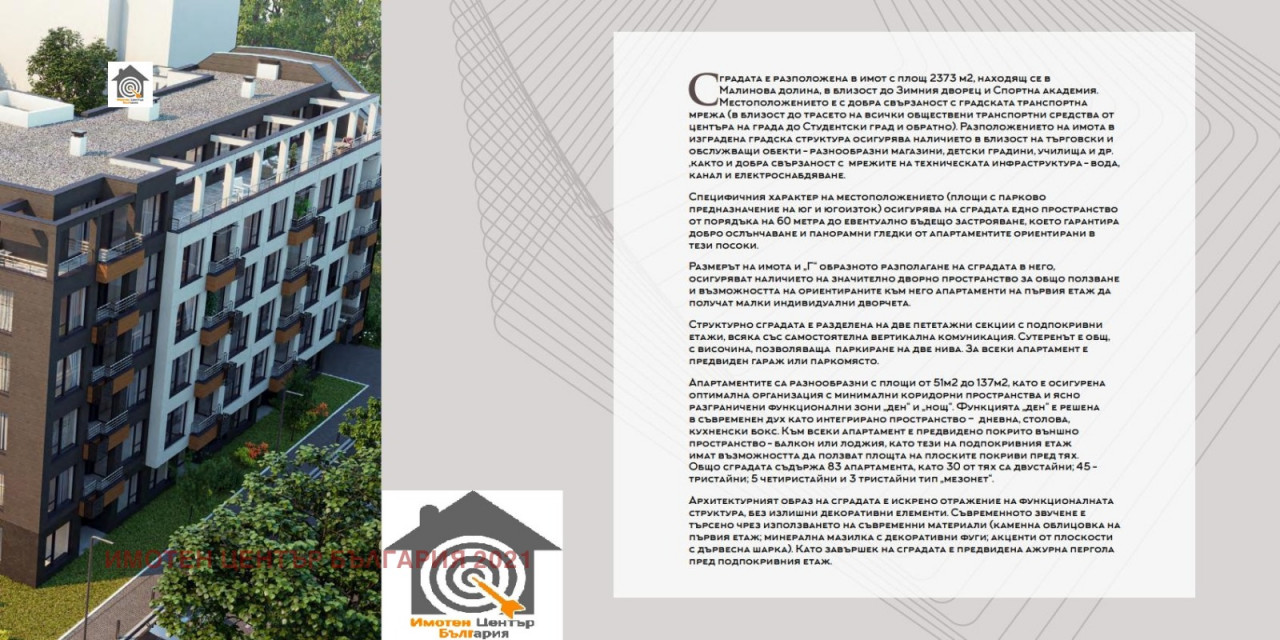 Агенция за недвижими имоти ' Имотен център България' предлага на вашето внимание елегантна бутикова сграда, в сърцето на 'Малинова Долина' сградата е разположена на метри от НСА, новата държавна детска градина, бърз и лесен достъп до основните пътни артерии: бул. Симеоновско шосе, околовръстен път. Строител с опит в изграждането на строителни обекти, работещ със собствени средства. Може да видите разнообразни имоти (едностайни, двустайни и тристайни) позиционирани на различни етажи с добро разпределение. Възможност за гъвкаво плащане. Цени от 1300 до 1420 с ДДС За контакти: 0877004888